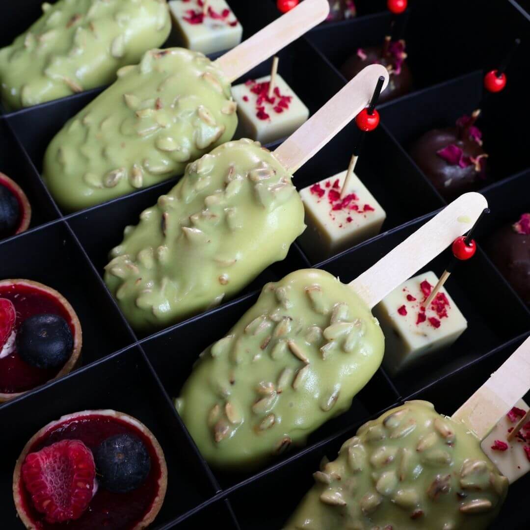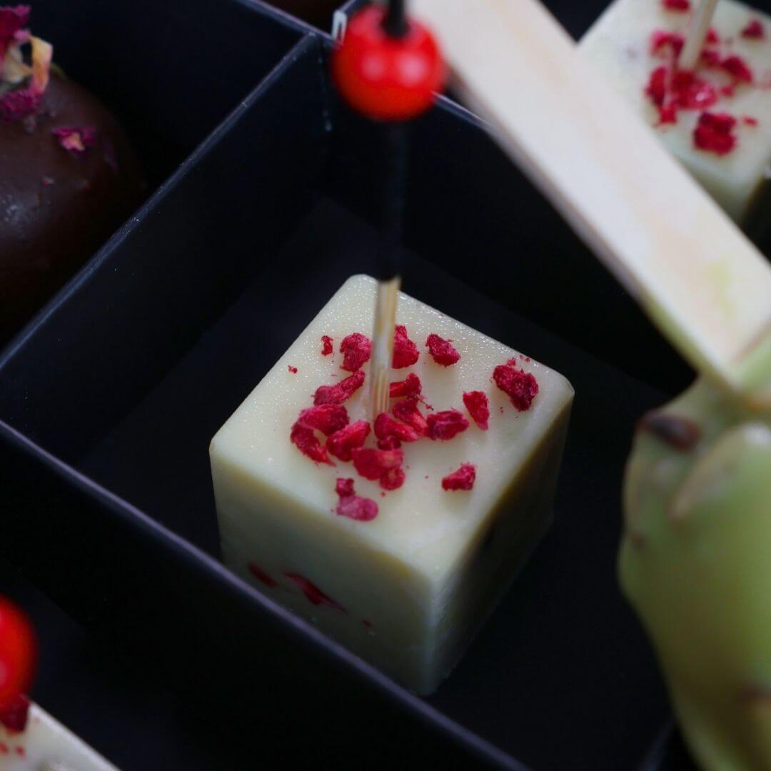 Pralina na bazie białej czekolady, w środku świeża malina i pistacja.