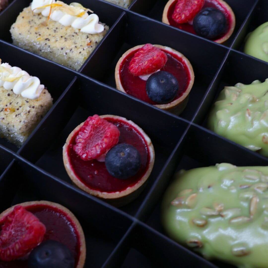 Chrupiąca tartaletka wypełniona kremem budyniowym, żelką na bazie owoców jagodowych i wykończona kremem na bazie białej czekolady i świeżych owoców.