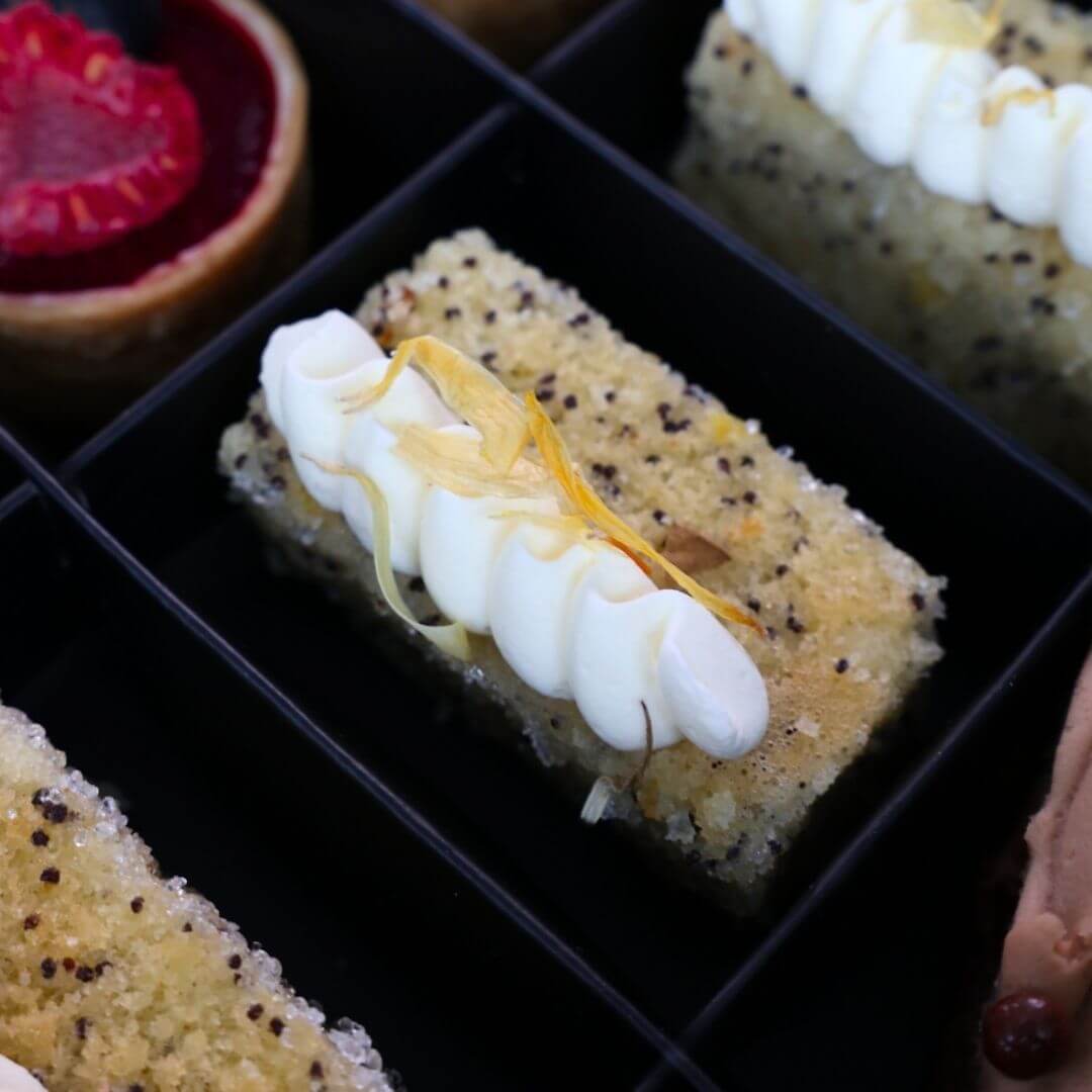 Pieczona babka cytrynowa z dodatkiem mąki migdałowej, maku i skórki z cytryny, namoczona syropem cytrynowym i zanurzona w cukrze, wykończona kremem z białej czekolady.