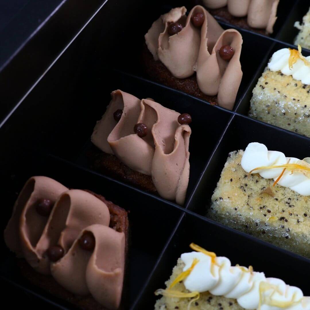 Czekoladowy financier pieczony z orzechem laskowym i wiśnią, zanurzony w polewie czekoladowej i wykończony kremem pralinownym na paście z orzecha laskowego.
